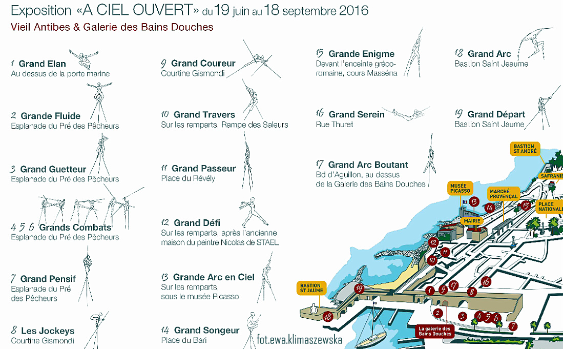 Całość ekspozycji nosi nazwę A ciel ouvert (Pod gołym niebem) i prezentuje dziewiętnaście instalacji plenerowych, postaci ludzkich, umieszczonych przez artystę na promenadzie wzdłuż kamiennych murów okalających miasto od strony morza, czy też czuwających nad nim, zawieszonych nad wąskimi uliczkami, albo zainstalowanych na esplanadzie du Pré aux Pêcheurs. Te niezwykle wymowne rzeźby z brązu, posadowione wysoko, umocowane na metalowych szczudłach nadają dynamizmu morsko-górskiemu krajobrazowi Antibes i są wdzięcznym tematem fotograficznym.