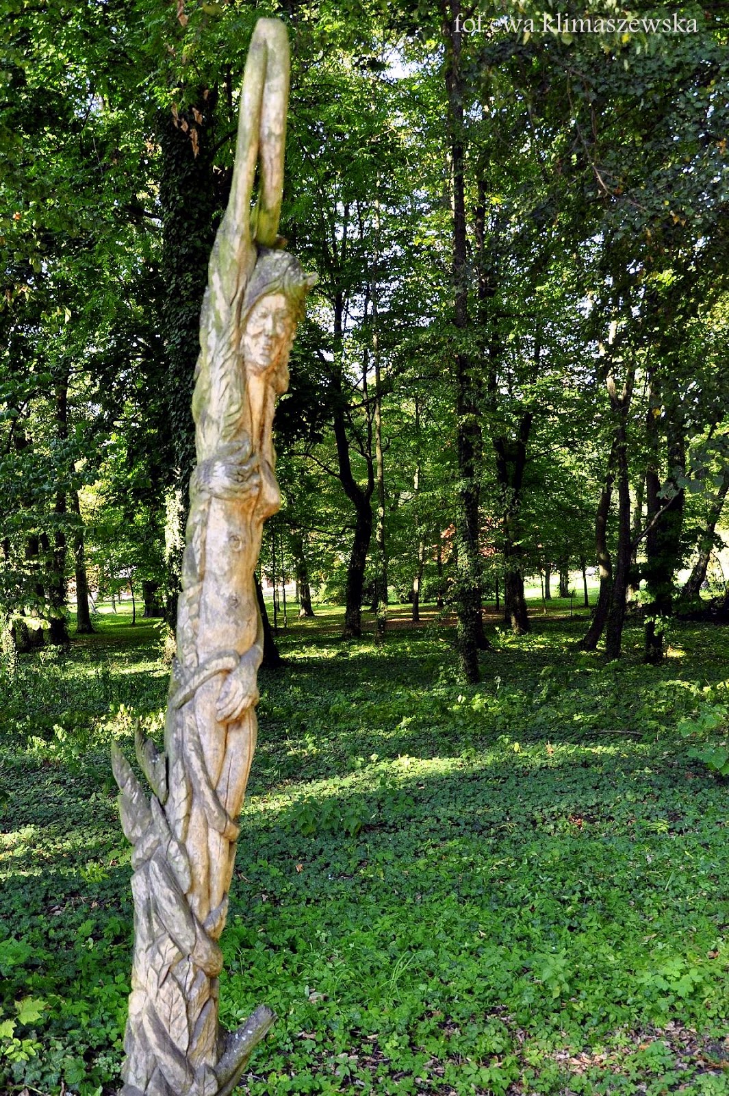 drewniane rzeźby ustawione w cieniu drzew, a także drewniany łasuch - miś z