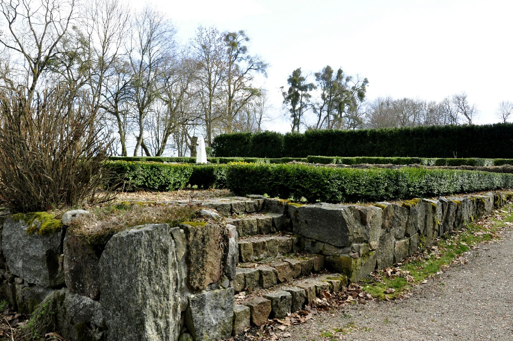zielona wstęga, opasają szpalery iglaków, bukszpanów i ozdobnych ostów. Założenie zostało odtworzone na dwóch kamiennych tarasach.